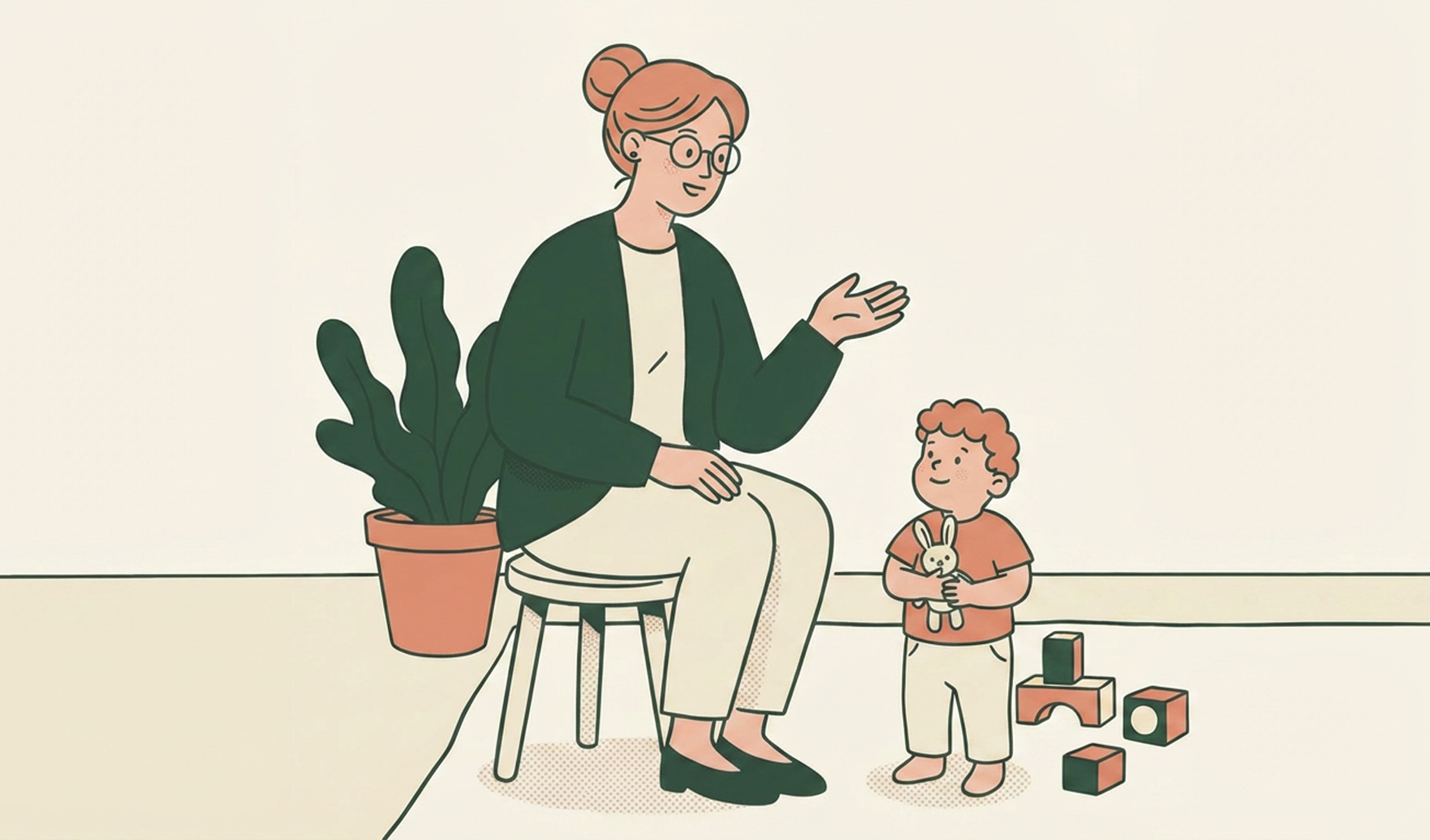 Illustration of a parent kneeling on the floor with a magnifying glass, exploring alongside a curious toddler